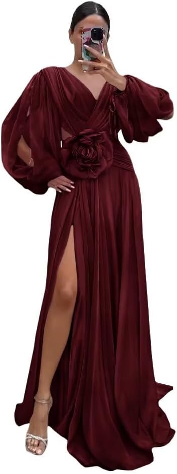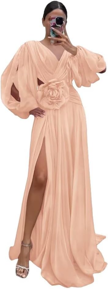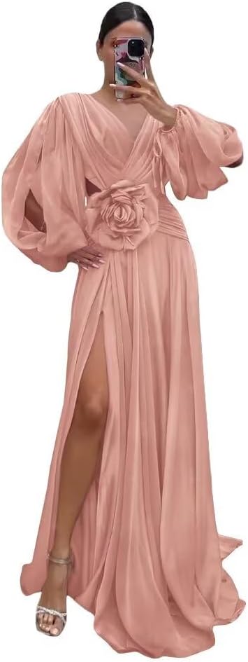 | Fabric Type | Women's Chiffon Long Sleeve Formal Party Dresses V Neck Floral Pleated Bridesmaid Dress with Side Slit |